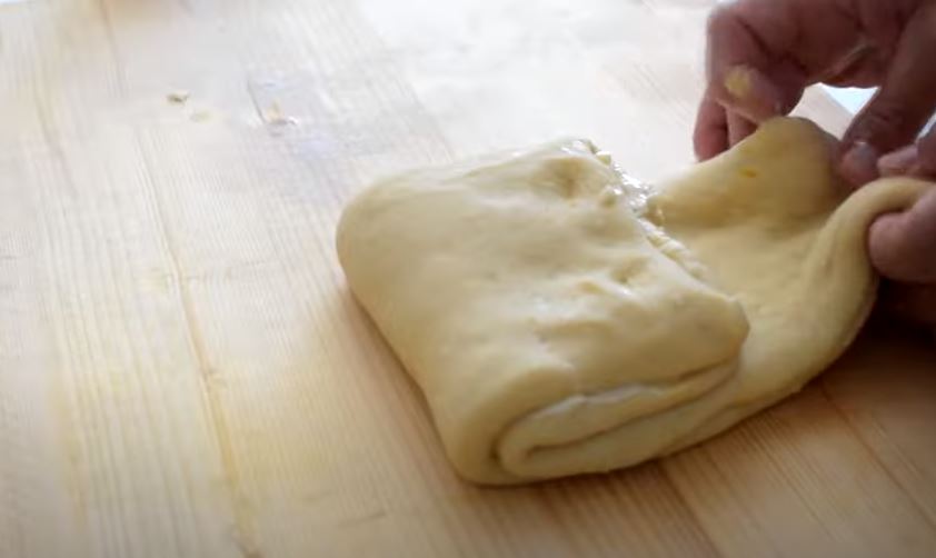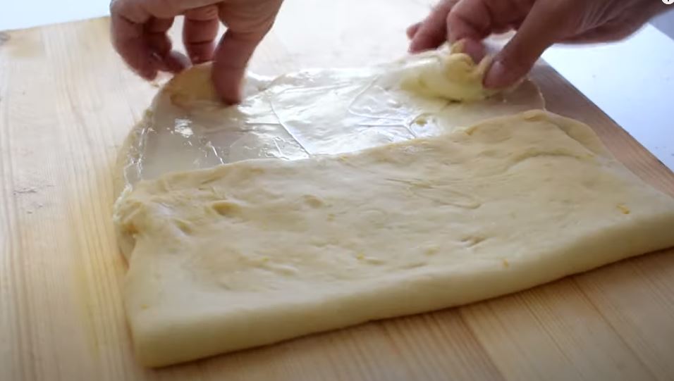 Διπλώνουμε την ζύμη σε προς τα μέσα της 2 στενές άκρες η μία να επικαλύπτει την άλλη και μετα προς το κέντρο. Τυλίγουμε με μεμβράνη και βάζουμε στην ψυγείο για μισή ώρα.