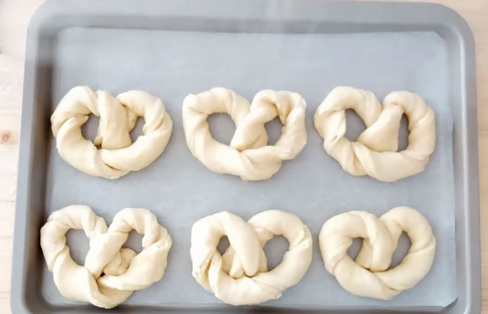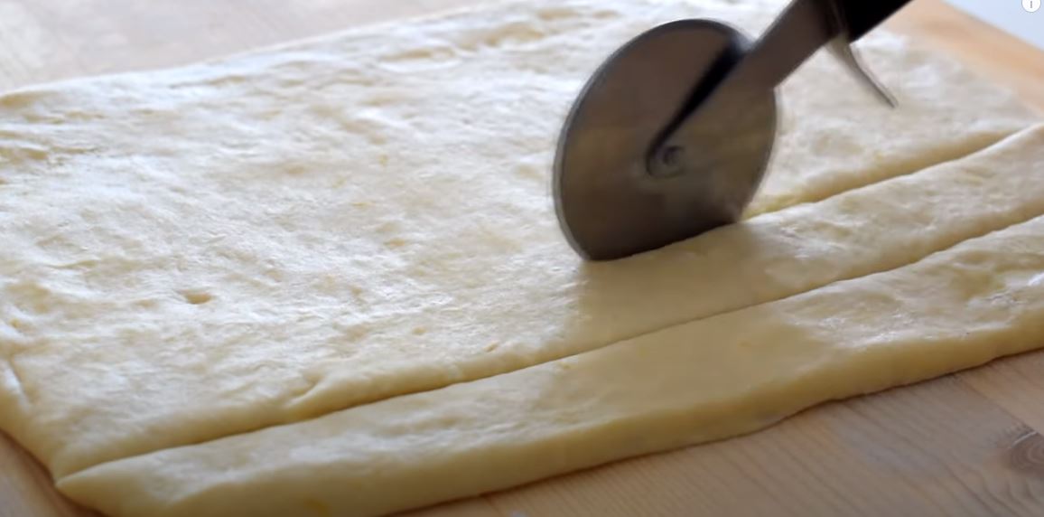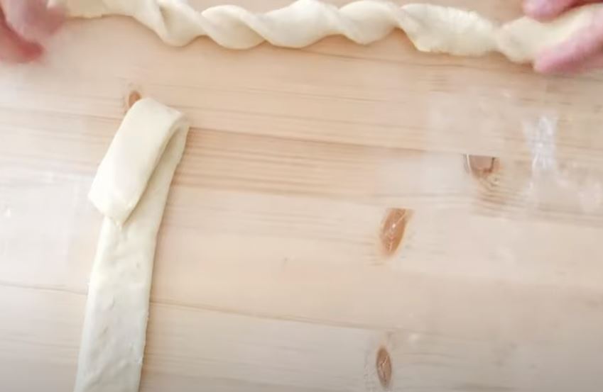 Κόβουμε την ζύμη σε λωρίδες και κάθε μία λωρίδα την στρίβουμε και στρίβουμε τις άκρες προς τα μέσα.