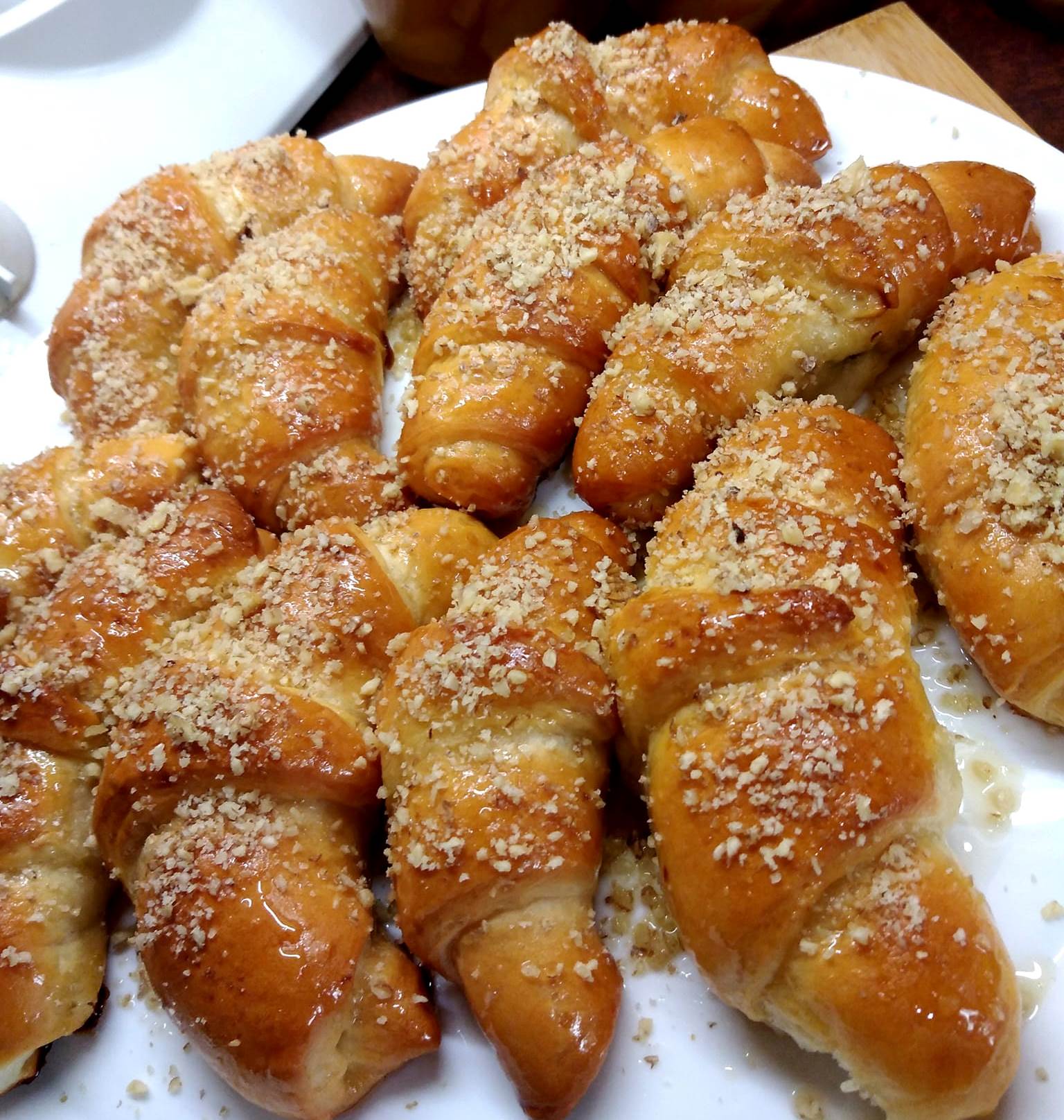 Ζέστα κρουασάν χλιαρό σιρόπι. Γίνονται 2 λαμαρίνες του φούρνου 32 μέτρια κομμάτια