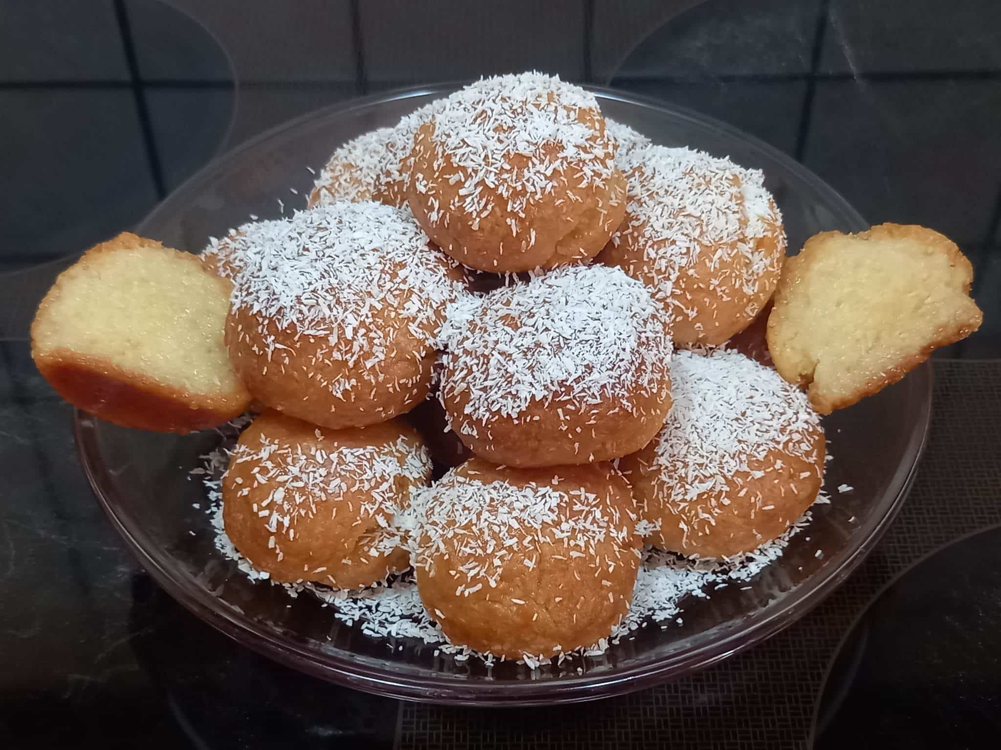 Πρέπει να έχουμε μια μαλακή ζύμη που να μην κολλά στα χέρια.Αν χρειαστεί βάζουμε λίγη καρύδα ακόμη.Πλάθουμε μικρά μπαλάκια και τα αραδιάζουμε σε ταψί στρωμένο με αντικολλητικό χαρτί.