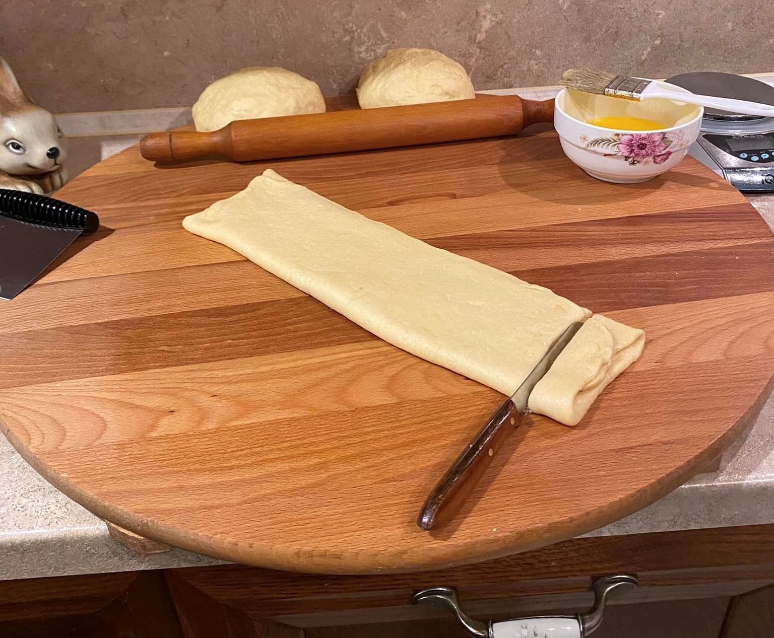 5. Χωρίζω τη ζύμη σε 3 ίσα μέρη. ανοίγω κάθε μέρος σε φύλλο διαστάσεων 35×35 εκ. περίπου.