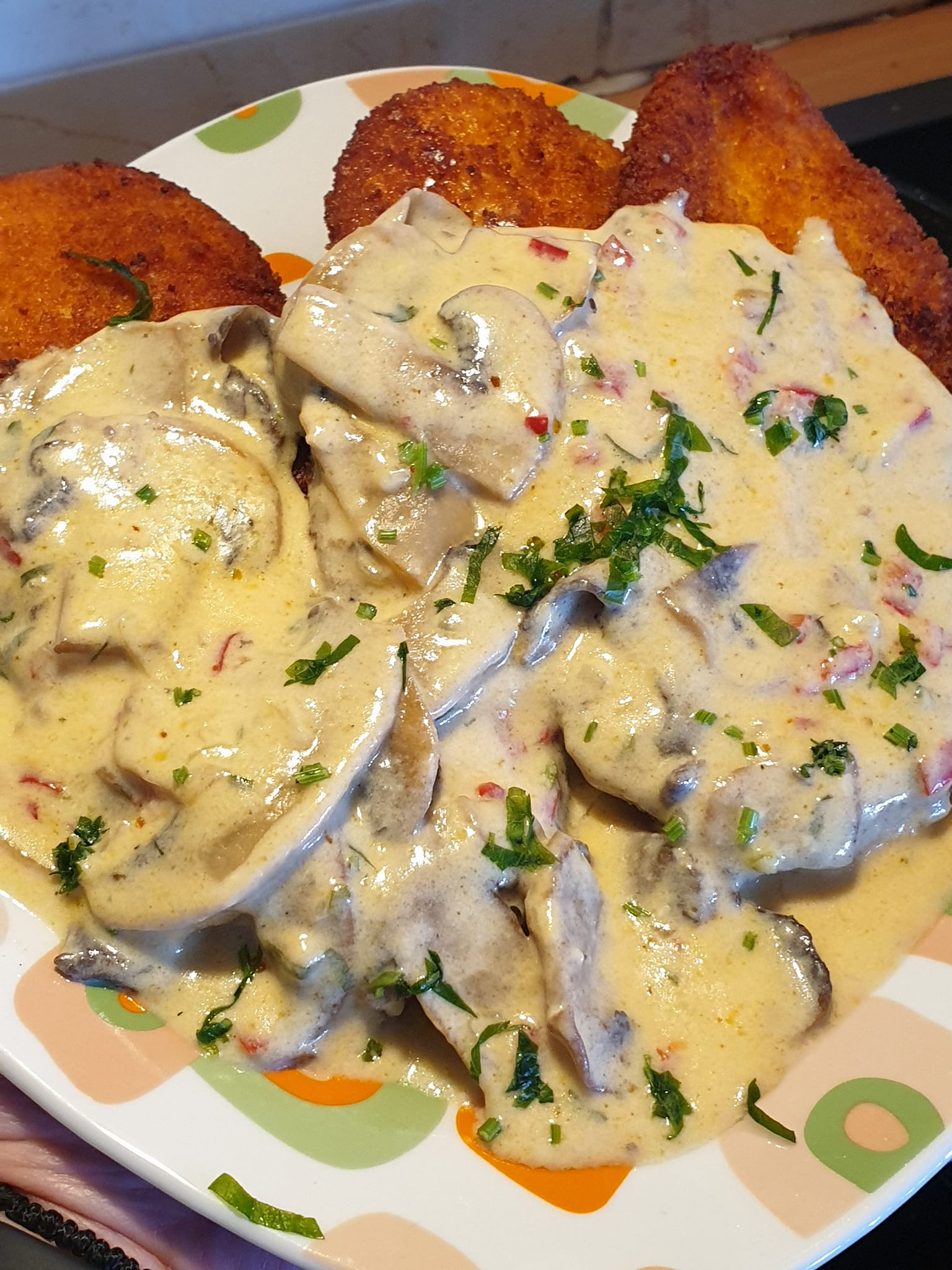Κοτόπουλο πανέ, χρυσαφένιο και τραγανό και στο εσωτερικό ζουμερό και μαλακό. Η σάλτσα μανιταριών ήταν πλούσια και γευστική, με μια ωραία κρεμώδη υφή. Τα μανιτάρια ήταν σοταρισμένα τελεια και ταιριαζαν άψογα με το κοτόπουλο.