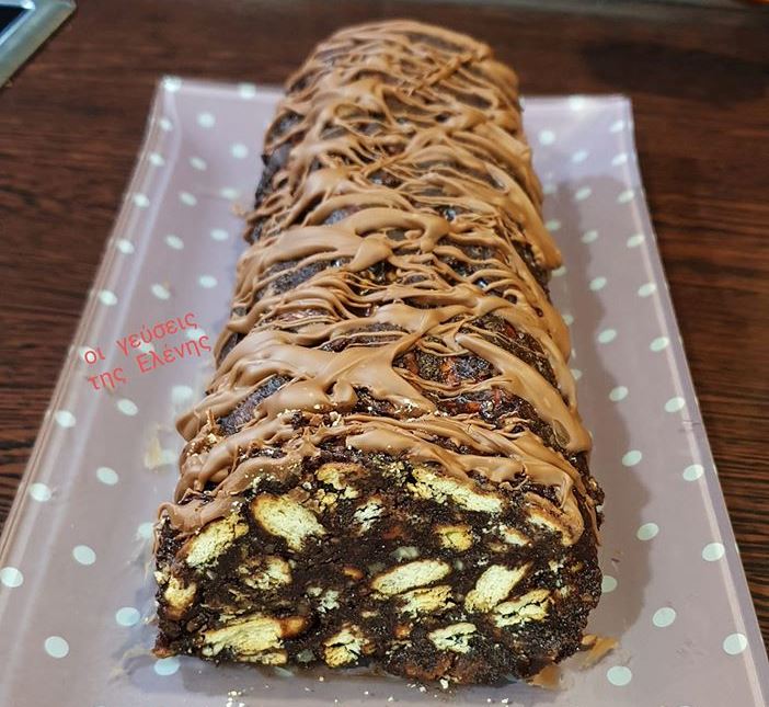 Βάζουμε σε ένα κατσαρολάκι το βιταμ και το λιώνουμε… αποσύρουμε από τη φωτιά και Ρίχνουμε την άχνη, το κακαο, τον χυμο, τα μπισκότα ( τα σπάμε με το χερι) και τα καρύδια… ανακατεύουμε καλά να ομογενοποιηθουν τα υλικά μας… τα Ρίχνουμε σε μια λαδόκολλα και το ρολαρουμε… με το χέρι μας δίνουμε κλείνοντας το το σχήμα του σαλαμιού… το βάζουμε στην κατάψυξη για τουλάχιστον 2 ώρες πριν το κόψουμε… οταν είναι έτοιμο το περιχύνουμε με λιωμένη σοκολάτα γάλακτος… το διατηρούμε είτε στο ψυγείο είτε στην κατάψυξη…