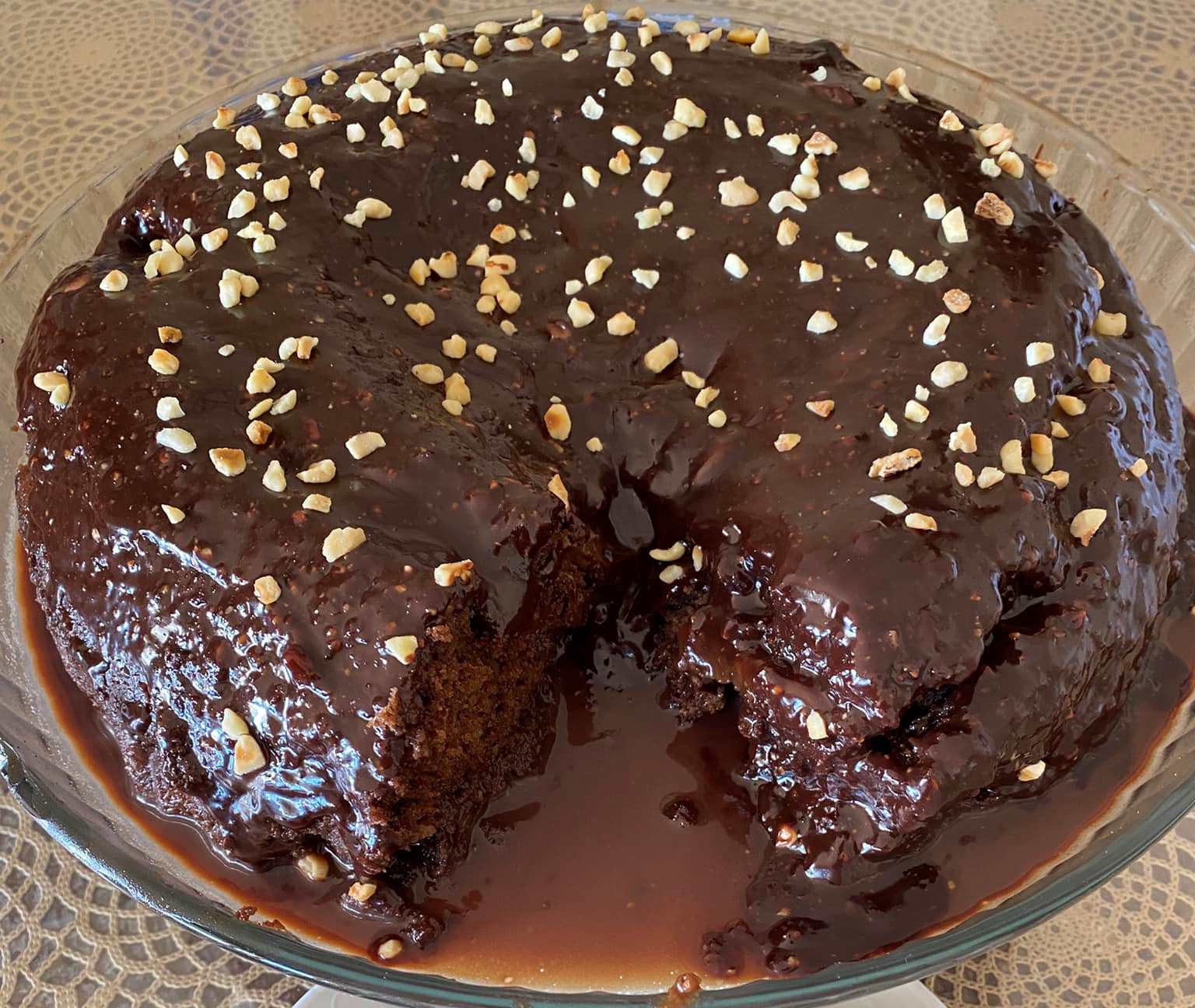 Όταν ψηθεί η σοκολατοπιτα, την βγάζουμε από τον φούρνο και την περιμένουμε με το κρύο σιρόπι.