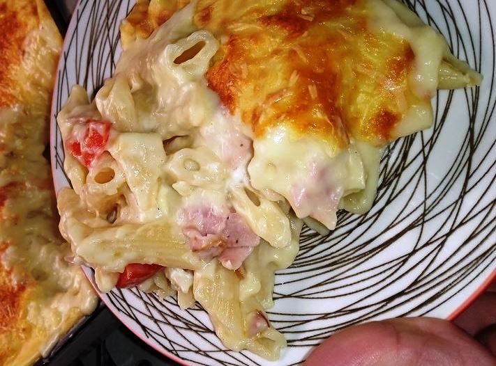 Βράζω τις πένες τις βάζω σε ένα πυρέξ ρίχνω λίγο ελαιόλαδο μπέικον η ζαμπόν ψιλοκομμένο, τυράκι ημίσκληρο, κόκκινη η πράσινη πιπεριά λίγο πιπέρι,