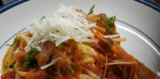 Σβήνουμε με το κρασί. Όταν εξατμιστεί το αλκοόλ, προσθέτουμε τις ντομάτες,πελτέ,ζαχαρη το σκόρδο, τα μπαχαρικά, αλάτι πιπέρι κατά βούληση και το ανάλογο νερό ώστε να σκεπάζει τα υλικά μας.
