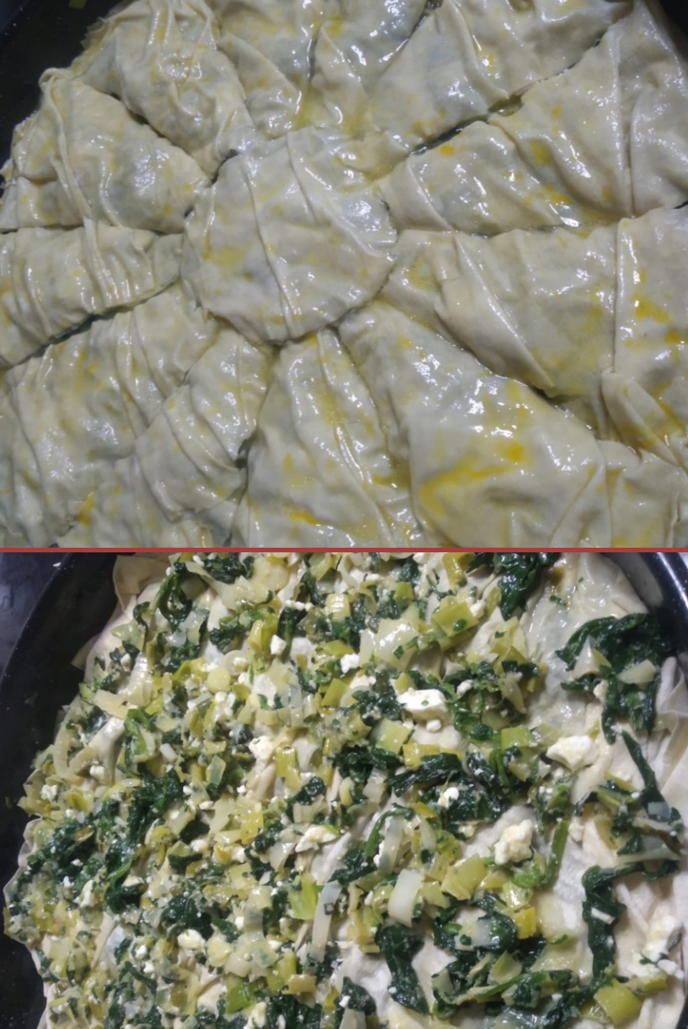 Λαδωνω ταψι 40 εκ. Απλώνω 2 φύλλα λαδωνω ενδιάμεσα και απλώνω το 1/3 τις γέμισης, συνεχίζω φύλλο λάδωμα, γέμιση, φυλλο λάδωμα, γεμιση.