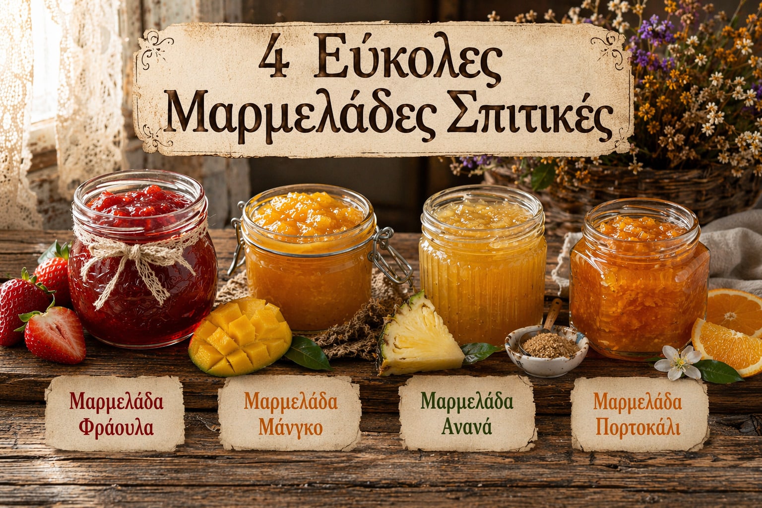 Οι σπιτικές μαρμελάδες είναι από τις πιο όμορφες και πρακτικές παρασκευές για πρωινό, γλυκά ή χρήση σε φούρνο και ζαχαροπλαστική. Με λίγα υλικά και σωστό βράσιμο μπορείς να πετύχεις υπέροχη υφή και έντονη γεύση φρούτου. Φράουλα, μάνγκο, ανανάς και πορτοκάλι — τέσσερις γεύσεις που ταιριάζουν τέλεια σε ψωμί, κρουασάν, τάρτες ή επιδόρπια.