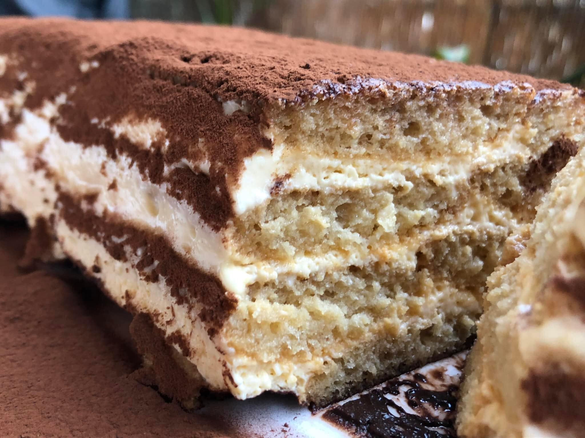 του κέικ καλύπτοντας όλη την επιφάνεια, τα σκεπάζουμε με το μειγμα της κρεμας και επαναλαμβάνουμε τη διαδικασία για να έχουμε ένα Tiramisu σε στρώσεις. Μόλις τελειώσουμε, πασπαλίζουμε με κακαο και βάζουμε στο ψυγείο όλο το βράδυ.