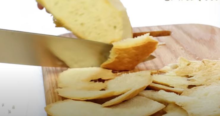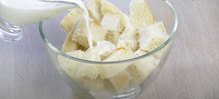 Αφαιρούμε την κόρα από μισό καρβέλι μπαγιάτικο ψωμί και το κόβουμε σε κύβους και τους βάζουμε σε ένα μπολάκι.