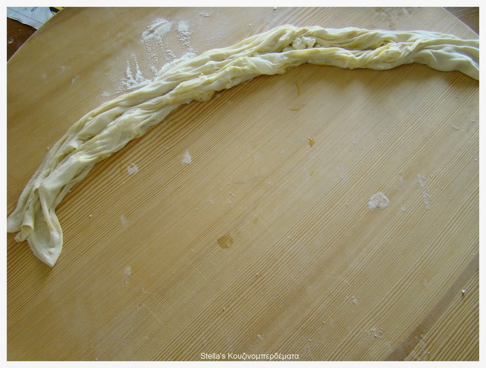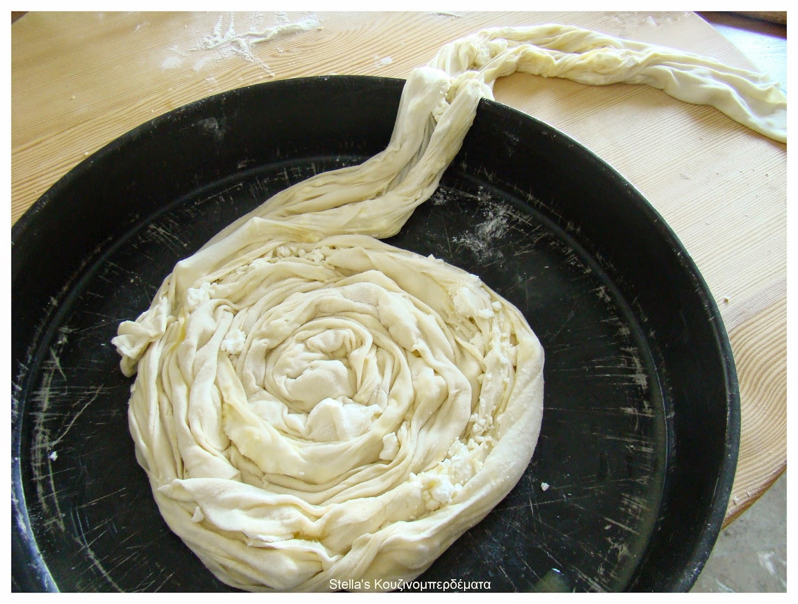 Αφού λοιπόν σχηματίσουμε το πρώτο μας ‘σαλιγκαράκι’ όπως περιγράφω στις ατομικές πιτούλες, το βάζουμε στο ταψί προσεκτικά και στο τέλος αυτού τοποθετούμε την αρχή του άλλου..κάπως έτσι..