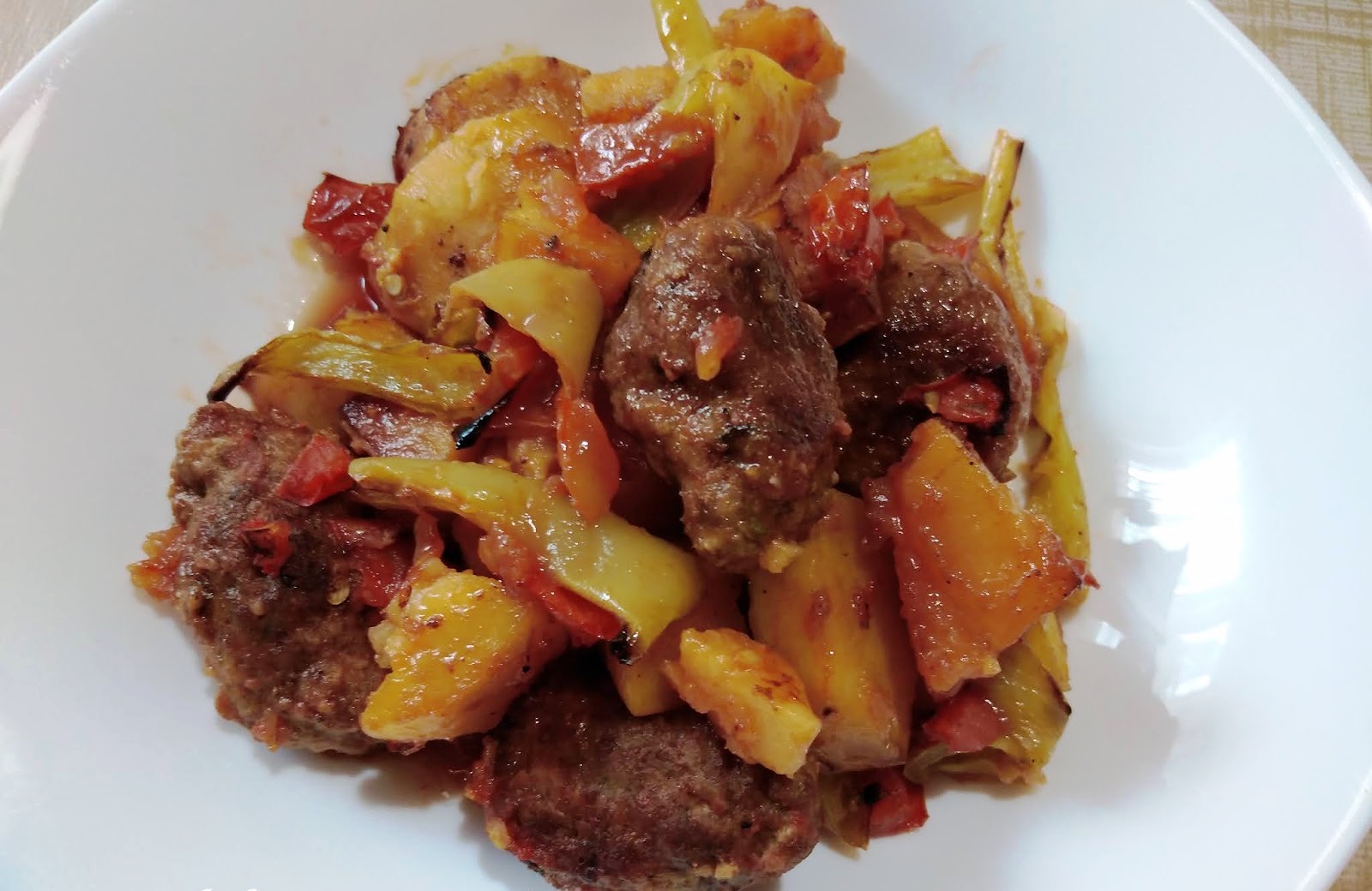 Οι ντομάτες κόβονται σε μικρά κομμάτια, πιπεριές σε λωρίδες, απλώνονται στα κεφτεδάκια και πατάτες.