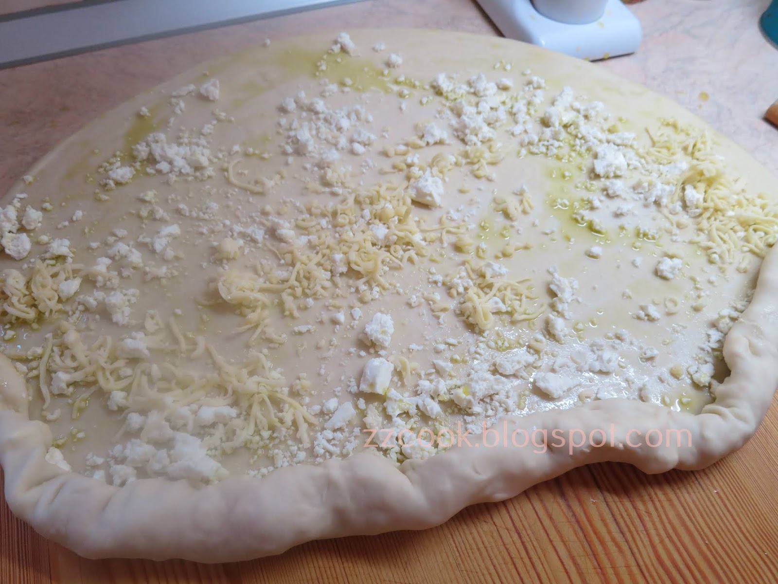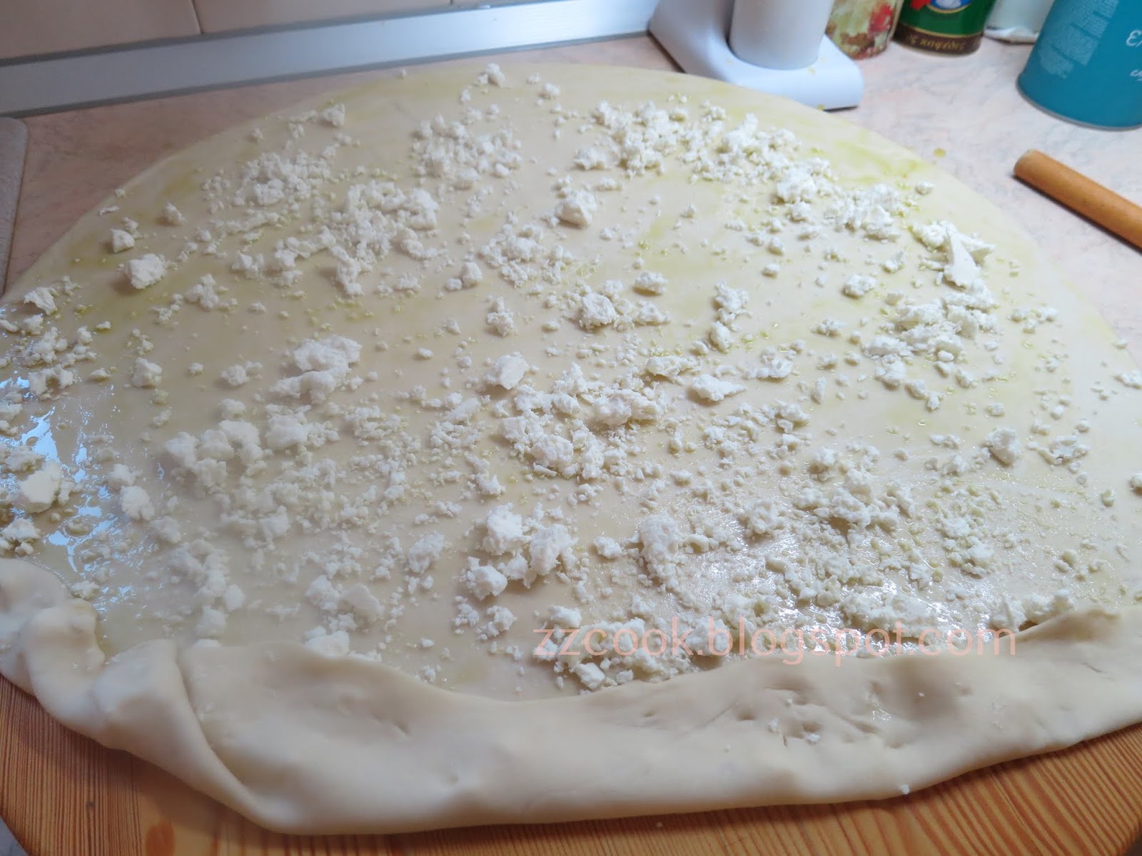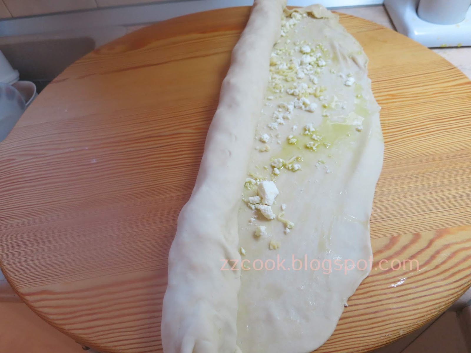 Ανοίγουμε τη ζύμη σε ένα μεγάλο φύλλο, όσο μεγάλο μπορούμε, το λαδώνουμε πασπαλίζουμε με το τυρί και τυλίγουμε σε ρολό.
