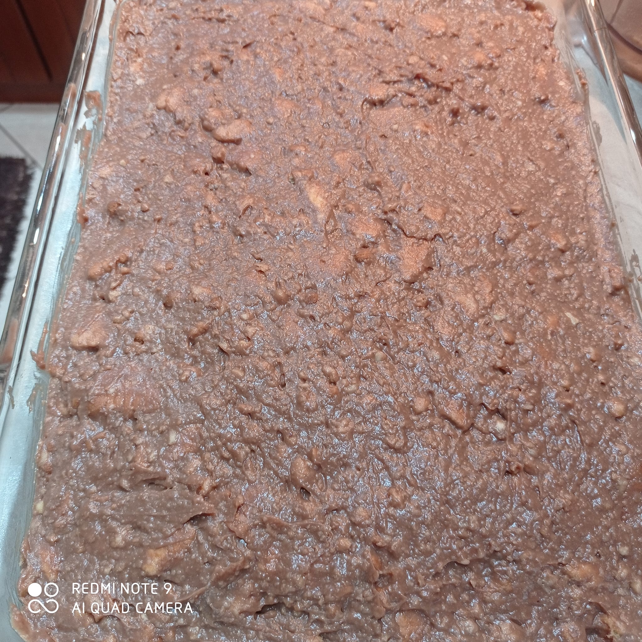 Τέλος σπάμε τα μπισκότα και ανακατεύουμε να ενωθούν όλα τα υλικά τοποθετούμε το μείγμα σε ένα πυρέξ το απλώνουμε να πάει παντού