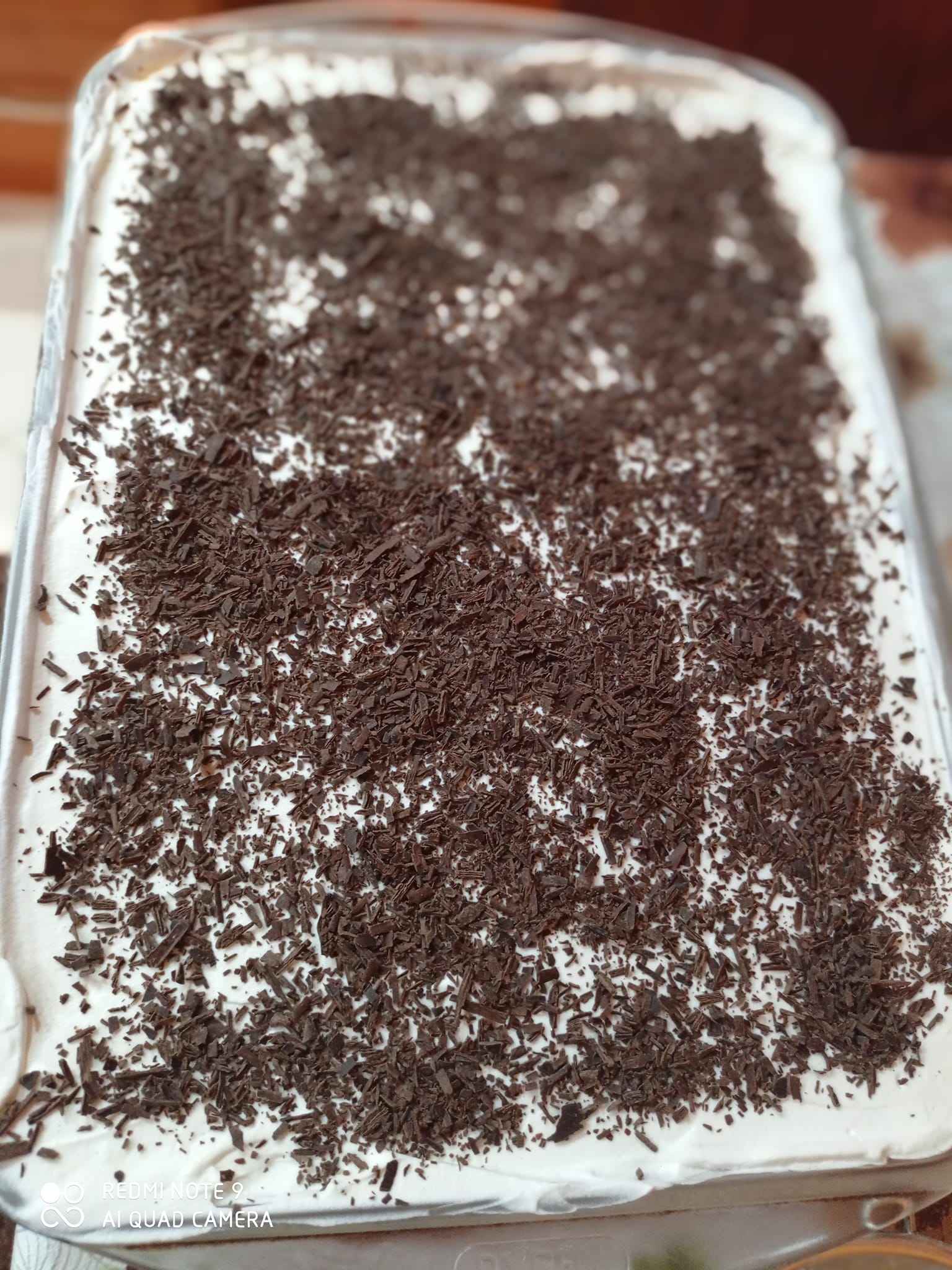 Την απλώνουμε πάνω από την τούρτα πασπαλίζουμε με τρίμματα σοκολάτας και την αφήνουμε για 4 ώρες στο ψυγείο