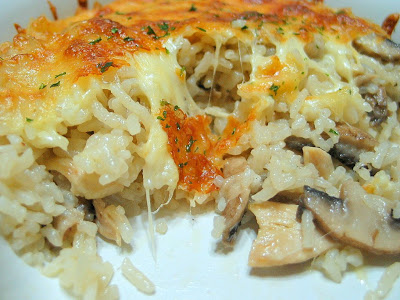 Όταν είναι έτοιμα και τα μανιτάρια, προσθέτετε το ρύζι, τα μπαχαρικά, το αλάτι, το μαύρο πιπέρι και το κόκκινο πιπέρι και το τηγανίζετε για 5 λεπτά. Στη συνέχεια το βάζετε σε ένα πυρέξ και προσθέτετε νερό από την κατσαρόλα όπου έχετε μαγειρέψει το κοτόπουλο και το ψήνετε για 5-10 λεπτά στους 220 βαθμούς.