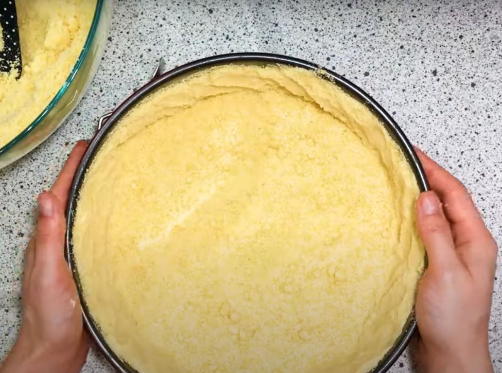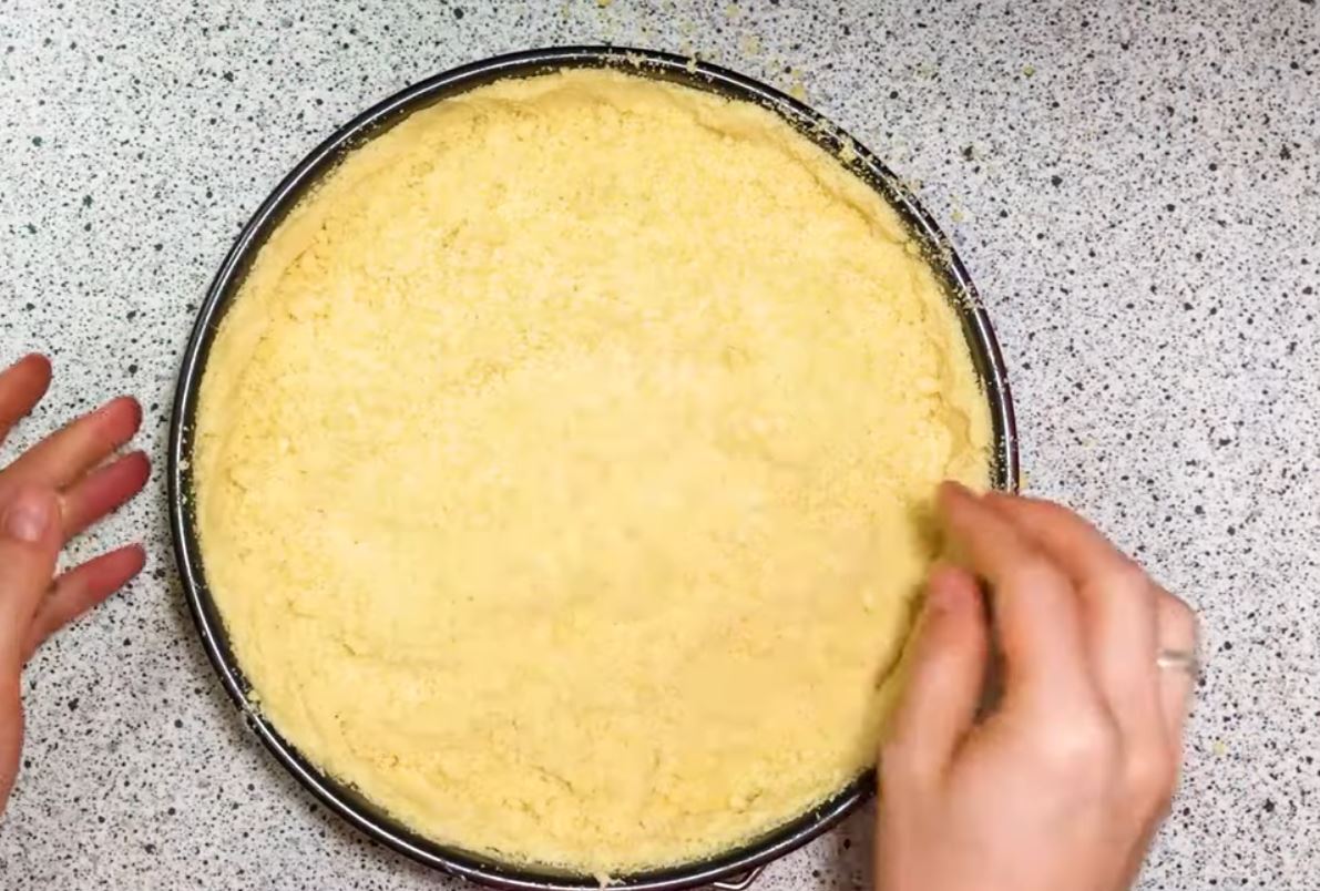 Βουτυρώνουμε ένα τσέρκι 28 εκ στρώνουμε την βάση με το μισό μείγμα αλεριου και λίγο