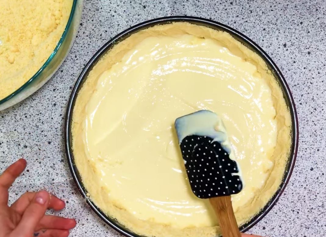Αδειάζουμε την κρέμα τυριού και απο πάνω το υπόλοιπο μείγμα