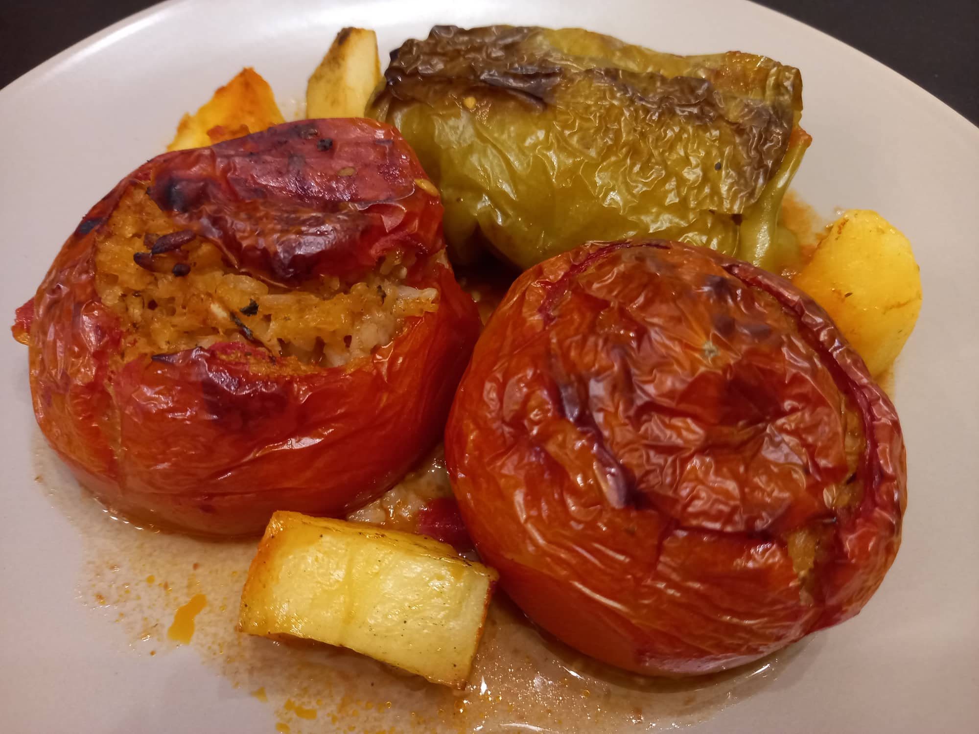 Πλένουμε τις ντομάτες και τις πιπεριές κόβουμε το κάτω μέρος από τις ντομάτες και βγάζουμε το εσωτερικό από τις ντομάτες με το ειδικό εργαλείο.