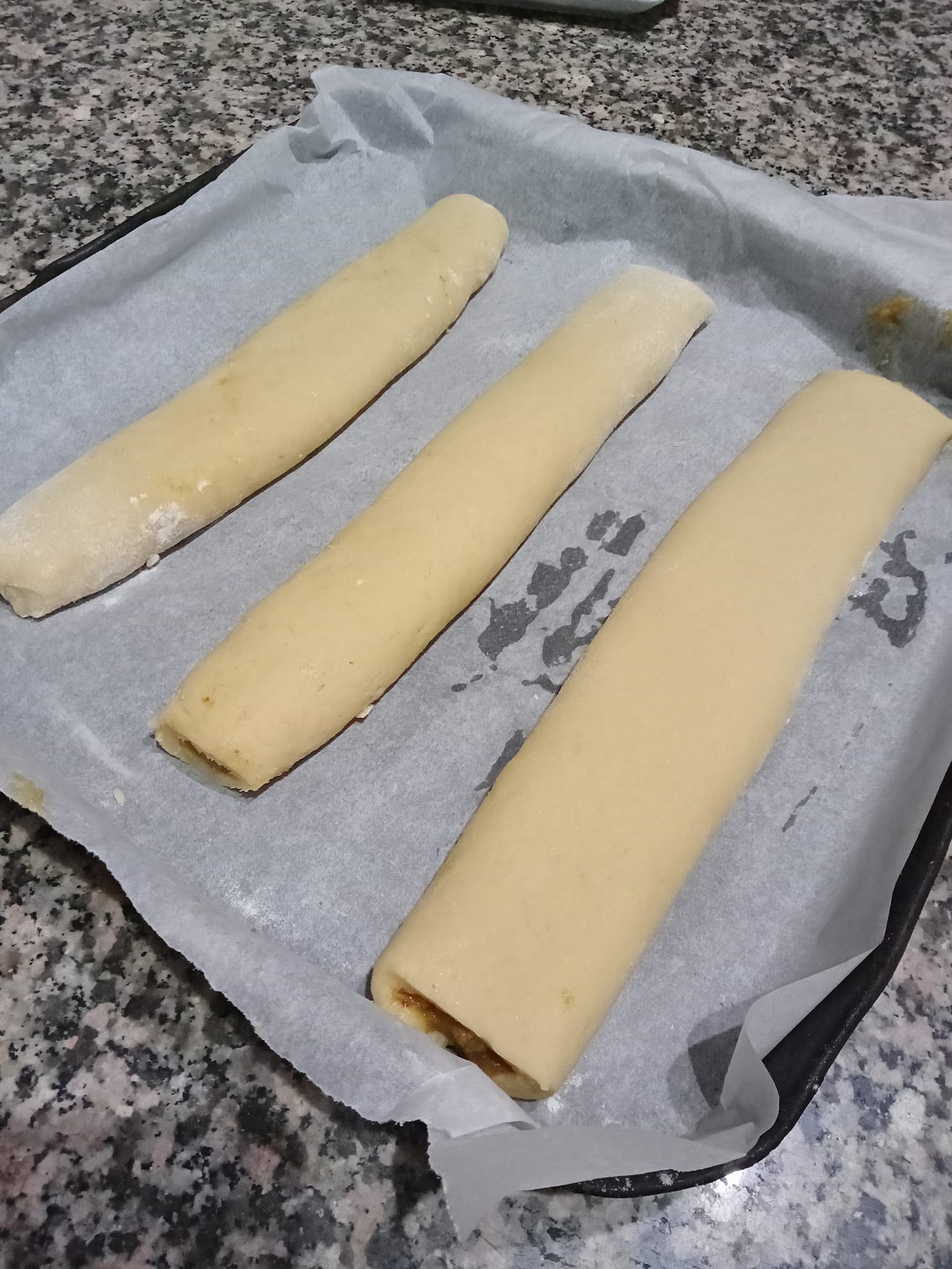 Χώρισα την ζύμη σε 4 μέρη, το ανοιξα σε ορθογώνια και έβαλα τη γέμιση στη μέση, τύλιξα το ζυμάρι προσπαθώντας να το σφραγίσω καλά, έβαλα το ρολό σε ένα ταψί καλυμμένο με χαρτί ψησίματος προσπαθώντας να βάλω από κάτω το κλεισιμο.