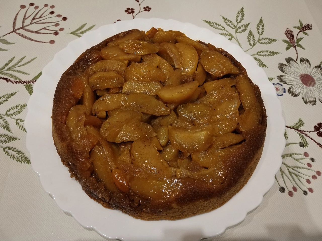 Ψήνω την πίτα για 40 λεπτά, το βγάζετε από τον φούρνο και το αναποδογυρίζετε αμέσως σε πιατέλα για να μην προλάβει να δέσει η καραμέλα, να βγει ρευστή καραμέλα από τη φόρμα, αλλειψτε τα μήλα με καραμελα απο το τηγανι για να γυαλίσουν όμορφα, η πίτα είναι έτοιμη.