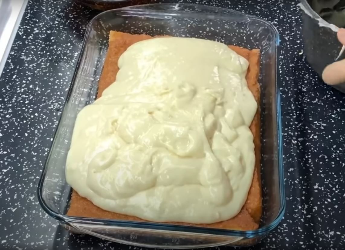 Βαζουμε τα κομμάτια σε ένα πυρέξ το 1 πρωτα και το σιροπιαζουμε πολυ καλα με το σιροπι και απο πάνω ριχνουμε την κρέμα.