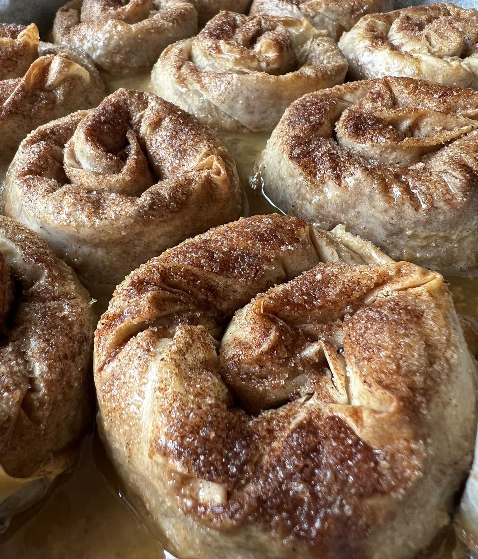 Αλείψτε 1 φύλλο με λίγη μαργαρίνη. Πασπαλίστε με 1 κουταλιά της σούπας από το μείγμα ζάχαρης-κανέλας και απλώστε 60 γρ. ταχίνι σε όλη την επιφάνεια.