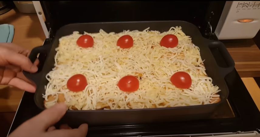 Πασπαλίζουμε με μπόλικο τυρί να καλυφθούν πλήρως οι πατατες και διακοσμούμε με μισά ντοματίνια.