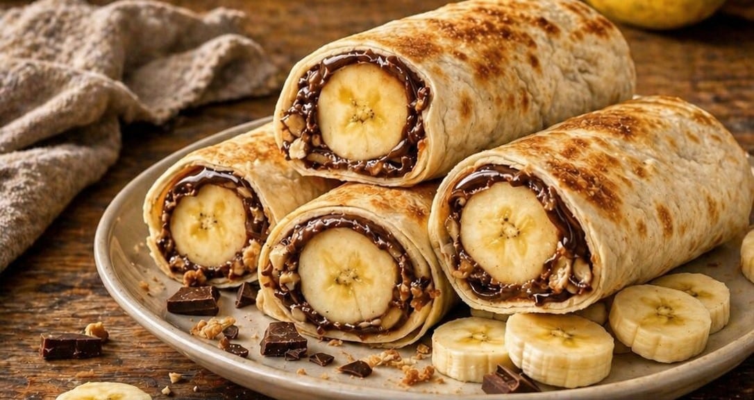 Τοποθετήστε μπανάνα και κομμάτια σοκολάτας σε μια πίτα λαβάς. Τυλίξτε σε ρολό και τηγανίστε ελαφρά μέχρι να λιώσει η σοκολάτα.