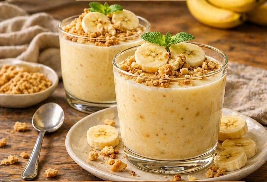 Ανακατέψτε λιωμένες μπανάνες, γάλα, ζάχαρη και κορν φλάουρ. Βράστε το μείγμα ανακατεύοντας μέχρι να πήξει. Σερβίρετε κρύο.
