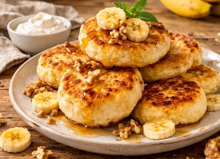 Ανακατέψτε τυρί cottage με λιωμένη μπανάνα, 1 αυγό και λίγο αλεύρι. Πλάστε μικρά δισκάκια και τηγανίστε τα μέχρι να πάρουν χρώμα.