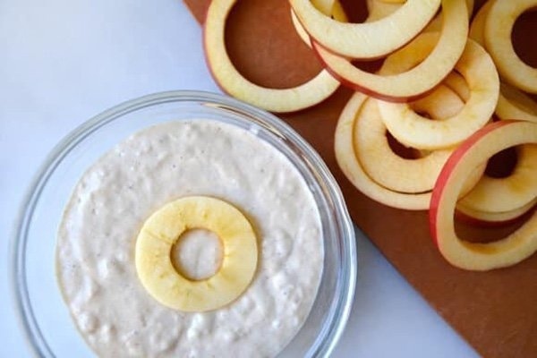 4. Βουτήξτε ένα κομμάτι μήλου στη ζύμη.