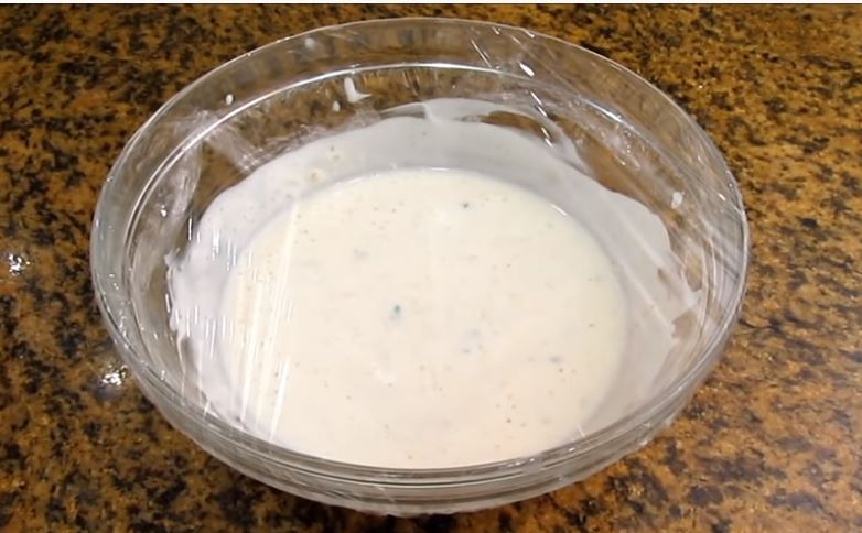 Καλύπτουμε με μια μεμβράνη και την αποθηκεύουμε στο ψυγείο ενώ συνεχίζουμε με τη συνταγή.