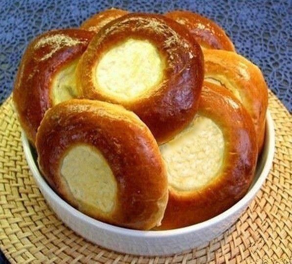 Πλάθω τη ζύμη σε μικρές, ίδιες μπαλίτσες και τις τοποθετώ σε μια λαδόκολλα σε απόσταση μεταξύ τους. Τις αφήνω για 20 λεπτά να φουσκώσουν. Στη συνέχεια, πιέζω τη μέση κάθε μπάλας ζύμης σχεδόν μέχρι κάτω. Τοποθετώ τη γέμιση στις εσοχές που προκύπτουν. Αλείφω όλα τα σπιτικά τυροπιτάκια με ένα μείγμα αυγού και γάλακτος και τα αφήνω για άλλα 10 λεπτά.