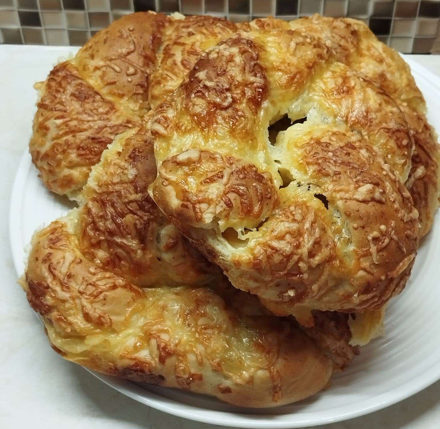 και τελευταίο το αλεύρι με το αλάτι έχουμε μια ζύμη εύπλαστή και τη βάζουμε να ξεκουραστεί για μία ώρα, στη συνέχεια αλευρώνουμε τα χέρια κόβουμε σε κομμάτια αναλόγως πόσα θέλουμε να φτιάξουμε τα κάνουμε μπαστούνια βάζουμε τυρί πάνω στον πάγκο ρολάρουμε πάνω στο τυρί δύο μπαστουνάκια το ένα πάνω στο άλλο, στριφογυρίζουμε και τα κάνουμε κουλούρι ή πλεξίδα τα αφήνουμε να ξεκουραστούνε για ένα τέταρτο με μισή ώρα