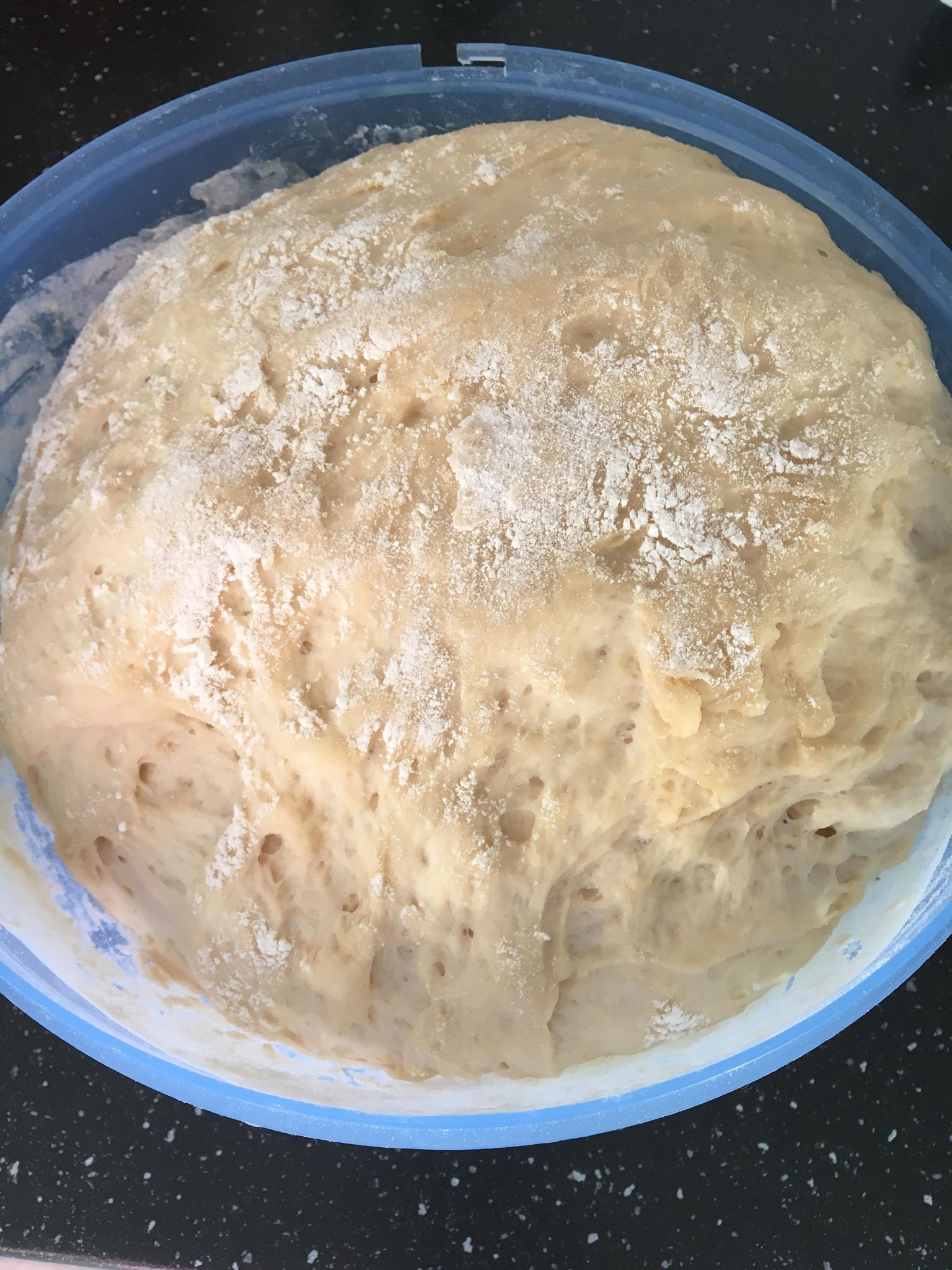 Αφού βάλω ένα κιλό αλεύρι, μεταφέρω τη ζύμη σε αλευρωμένη επιφάνεια και αν χρειαστεί ανακατεύω άλλο μισό φλιτζάνι αλεύρι. Η ζύμη πρέπει να είναι πολύ απαλή στην αφή, αλλά σε καμία περίπτωση δεν πρέπει να κολλάει στα χέρια. Ζυμώνουμε για τουλάχιστον 6-8 λεπτά.