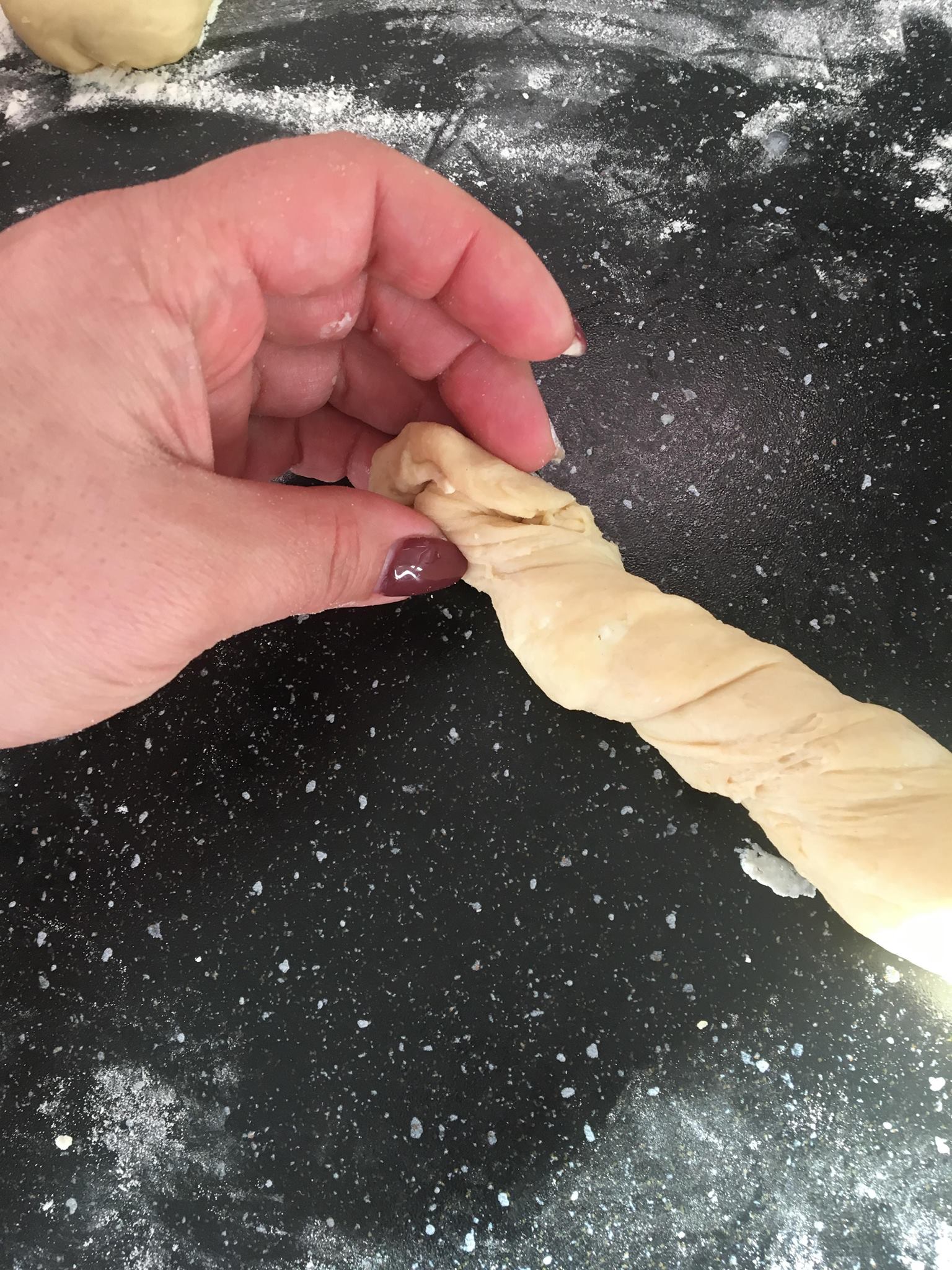 Κάνω το ίδιο με ένα άλλο κομμάτι, μετά στρίβω τα δύο ρολά και ενώνω τις άκρες για να φτιάξω ένα κουλούρι.