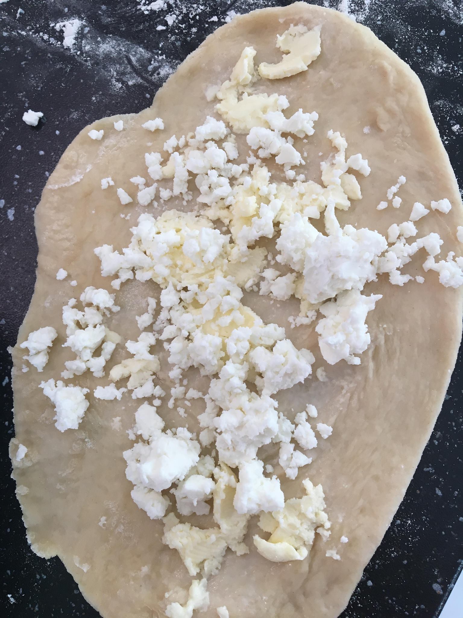 Παίρνω ένα κομμάτι, βάζω από πάνω λίγη ποσότητα από το βούτυρο και πιέζω με τα δάχτυλά μου μέχρι να απλωθεί το βούτυρο σε όλη την επιφάνεια και συνεχίζω να πιέζω μέχρι να γίνει μια σχετικά λεπτή ορθογώνια κρούστα. Πασπαλίζω με τυρί και τυλίγω σε ρολο.