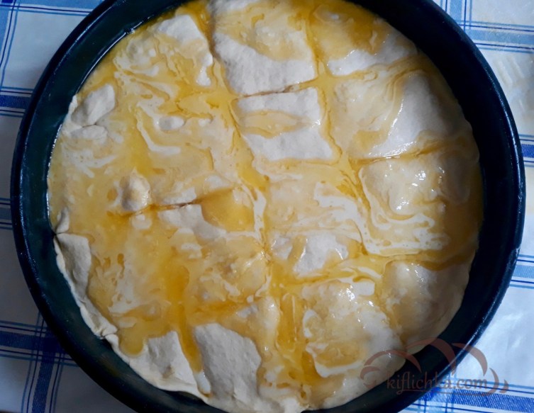 Με τον τρόπο που έχει ήδη περιγραφεί, σχηματίζω το πάνω φύλλο από τις άλλες 6 μπάλες. Αυτός το φύλλο έχει διάμετρο ίσο με αυτό του ταψιού. Το έβαλα πάνω στην γέμιση.