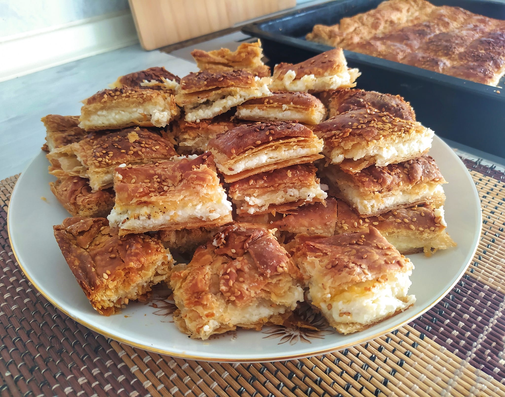 6. Αφού μπουν όλα τα φύλλα, κόβουμε την πίτα σε κομμάτια και πασπαλίζουμε με νερό και αν θέλουμε και λίγο σουσάμι.