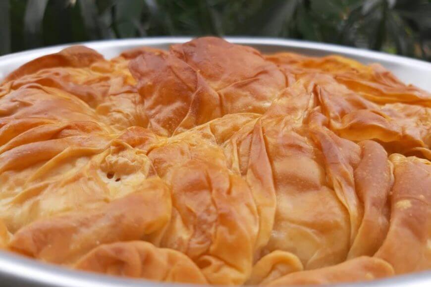 Γυρνάμε το φύλλο που προεξέχει και ανοίγουμε το τέταρτο φύλλο, κλείνουμε την πίτα πολύ σουρωτό σαν καπάκι από πάνω λαδώνουμε και ψήνουμε σε προθερμασμένο φούρνο στους 200 βαθμούς στις αντιστάσεις 40-45 λεπτά ανάλογα τον φούρνο.
