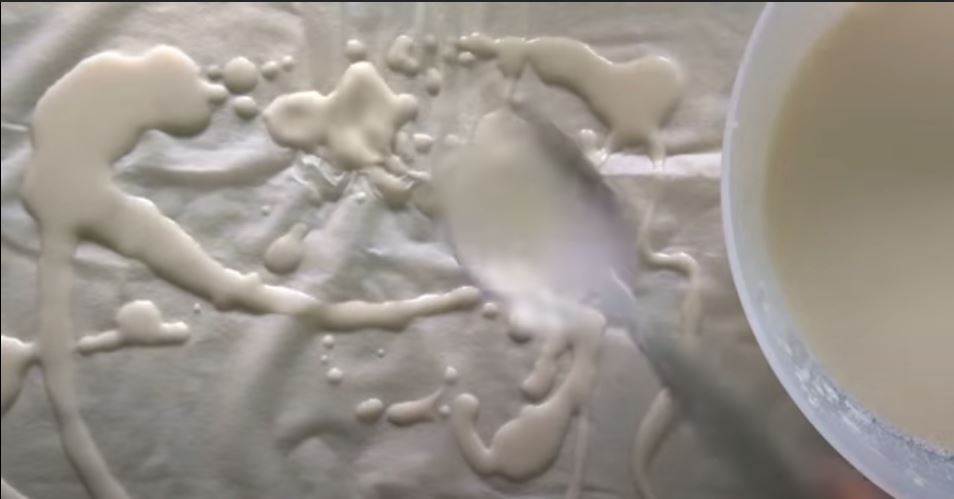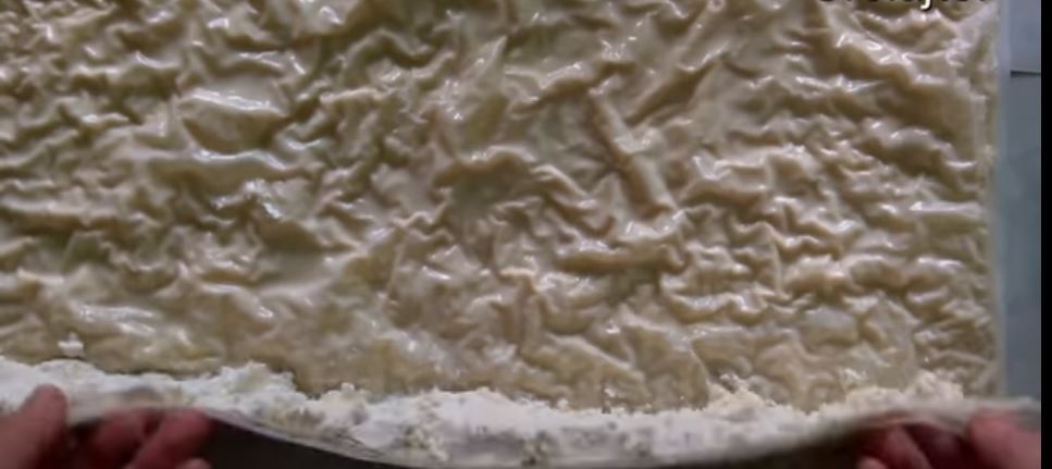 Παίρνουμε το πρώτο φύλλο και απλώνουμε σε κάθε φίλο κρούστα 4-5 κουταλιές της σούπας από το υγρό μείγμα ενώ στοιβάζουμε το ένα πάνω στο άλλο.