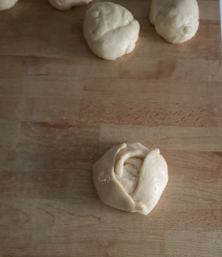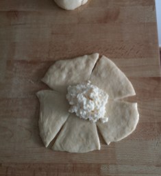 Παίρνουμε τη ζύμη σε μερίδες που έχω (δηλαδή φτιάχνουμε μπάλες στο μέγεθος μιας μπάλας τένις) και αρχίζουμε να φτιάχνουμε τα τυριά. Τα έφτιαξα σε σχήμα λουλουδιού σύμφωνα με τις παρακάτω εικόνες ⤵️.