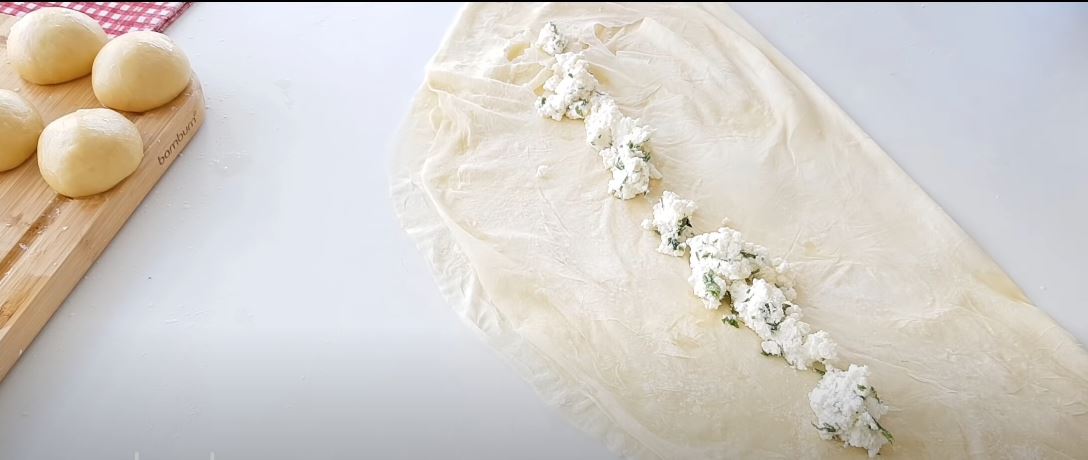 Βάζουμε τη γέμιση της αρεσκείας μας (φέτα, τυρί) στο κέντρο του φύλλου.