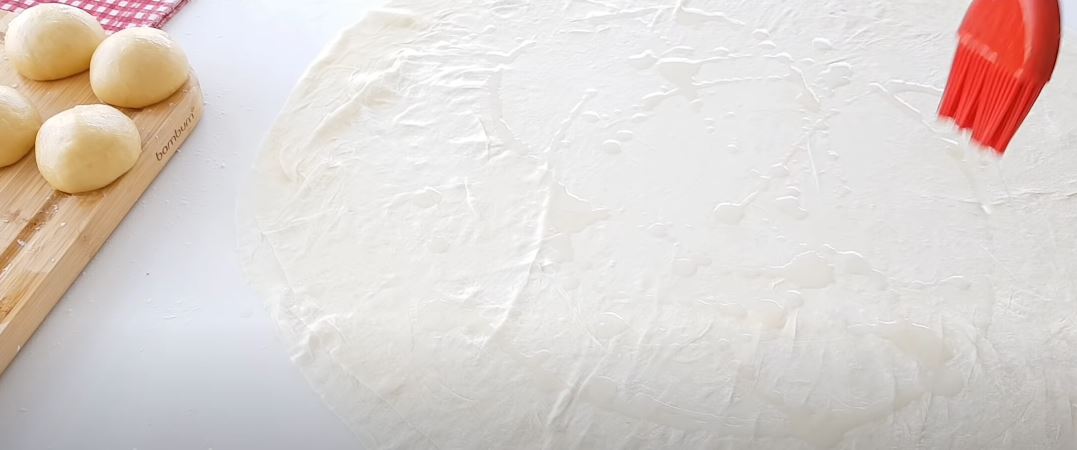 Ανοίγουμε κάθε μπαλάκι σε λεπτό φύλλο με πλάστη.