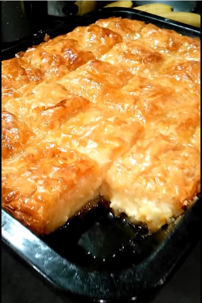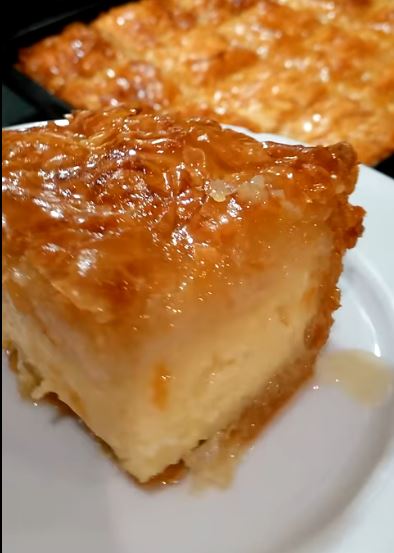 Βουτυρώνουμε ενα ταψί 38×25 περίπου και στρώνουμε ένα ένα τα φύλα τα οποία αλείφουμε με βούτυρο λιωμένο. Τα αφήνουμε να βγαίνουν προς τα έξω.. μόλις χλιαρυνει η κρέμα την ρίχνουμε στο ταψι και μαζεύουμε τα φύλλα προς τα μέσα πανω στην κρέμα και βουτυρώνουμε καλά.. συνεχίζουμε με τα υπόλοιπα μισά φύλλα….μόλις τελειώσουμε χαράζουμε σε κομμάτια και ψήνουμε σε προθερμασμενο φούρνο στους 180 βαθμούς για 1 ώρα περίπου μέχρι να ροδισει καλά !μόλις ψηθεί ρίχνουμε πανω του όλο το κρύο σιρόπι! αφήνουμε να το απορροφήσει ολο! καλυτερα να το κόψουμε την επόμενη μέρα!