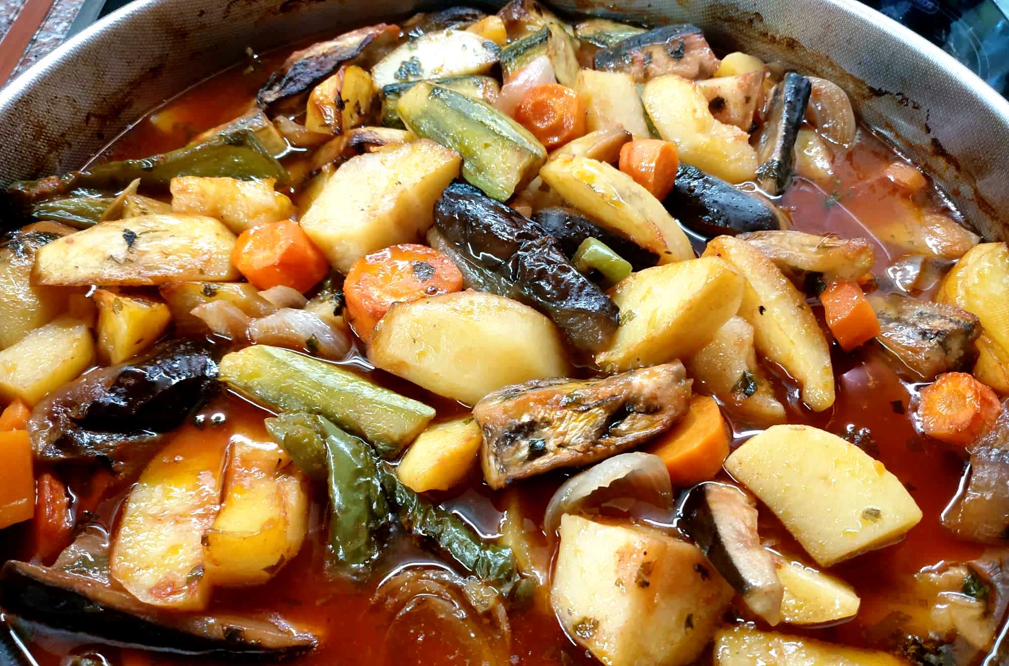 Πλένουμε και ξεφλουδίζουμε τα λαχανικά μας. Κόβουμε τις πατάτες σε κύβους, τα κολοκύθια σε στρογγυλές φέτες, τα καρότα και τις μελιτζάνες σε μισές φέτες, τα κρεμμύδια και τις πιπεριές σε λωρίδες, και ψιλοκόβουμε τις ντομάτες και το μαϊντανό. Τα βάζουμε όλα στο ταψί, αλατοπιπερώνουμε και ανακατεύουμε.