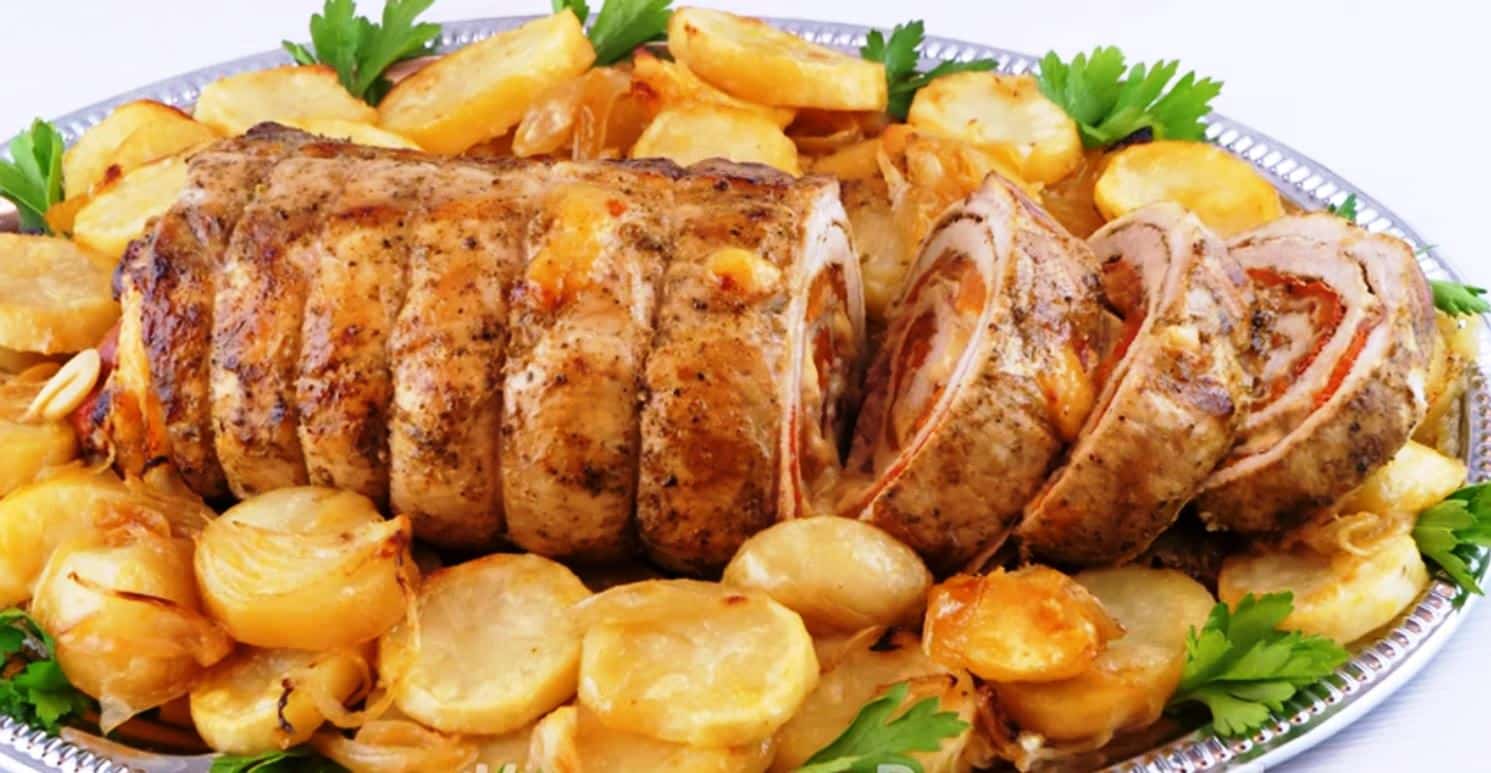 Κόβουμε τις πατάτες και τα κρεμμύδια σε φέτες τα ανακατεύουμε με το λάδι και τα μπαχαρικά και τα στρώνουμε στο ταψί. Τοποθετούμε από πάνω το ρολό και το αλείφουμε με την υπόλοιπη μαρινάδα. Σκεπάζουμε σφιχτά με αλουμινόχαρτο και ψήνουμε στους 200 βαθμούς για μία ώρα. Στο τέλος αφαιρούμε το αλουμινόχαρτο και ψήνουμε για άλλα 20 λεπτά μέχρι να ροδίσει καλά. Αφήνουμε να σταθεί λίγο αφαιρούμε τον σπάγγο και κόβουμε σε φέτες