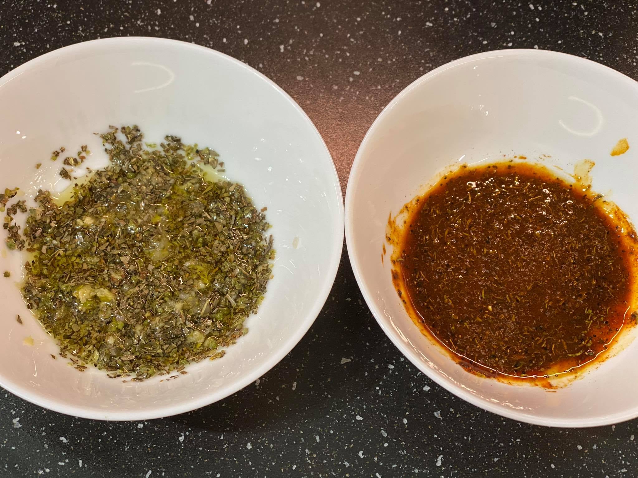 Κατά τη διάρκεια αυτής της περιόδου, ετοιμάστε το μείγμα. Το λάδι χωρίζεται στα δύο. Στο ένα μέρος προσθέστε το θρυμματισμένο σκόρδο, ρίγανη και αλάτι για γεύση. Βάλτε τα υπόλοιπα μπαχαρικά στο άλλο μέρος του λαδιού.