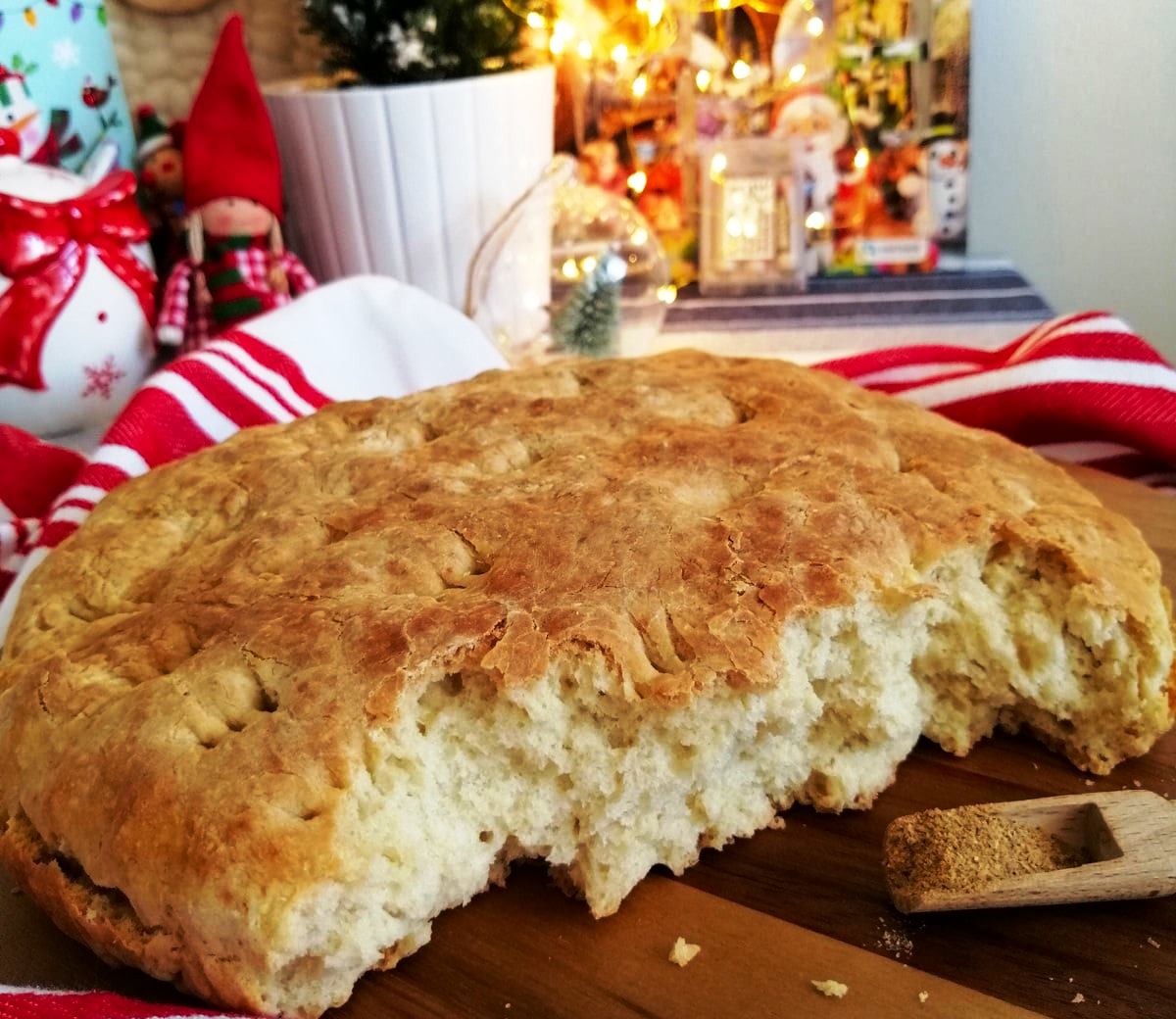 Λαδώνω ελαφρά ένα στρογγυλό ταψί διαμέτρου 25 εκ. και απλώνω το ψωμί, απλώνοντάς το ομοιόμορφα. Το κάρφωσα παντού με ένα πιρούνι και το έβαλα να ψηθεί σε προθερμασμένο φούρνο 170 γρ. για 35-40 λεπτά περίπου. Είναι έτοιμο όταν έχει φουσκώσει εμφανώς, έχει χρυσή κρούστα και ένα ξυλάκι που βάζουμε μέσα του βγαίνει στεγνό. Έβγαλα το ταψί από το φούρνο, ψέκασα ελαφρά το ψωμί με νερό και το σκέπασα με μια βαμβακερή πετσέτα για να μαλακώσει η κρούστα.